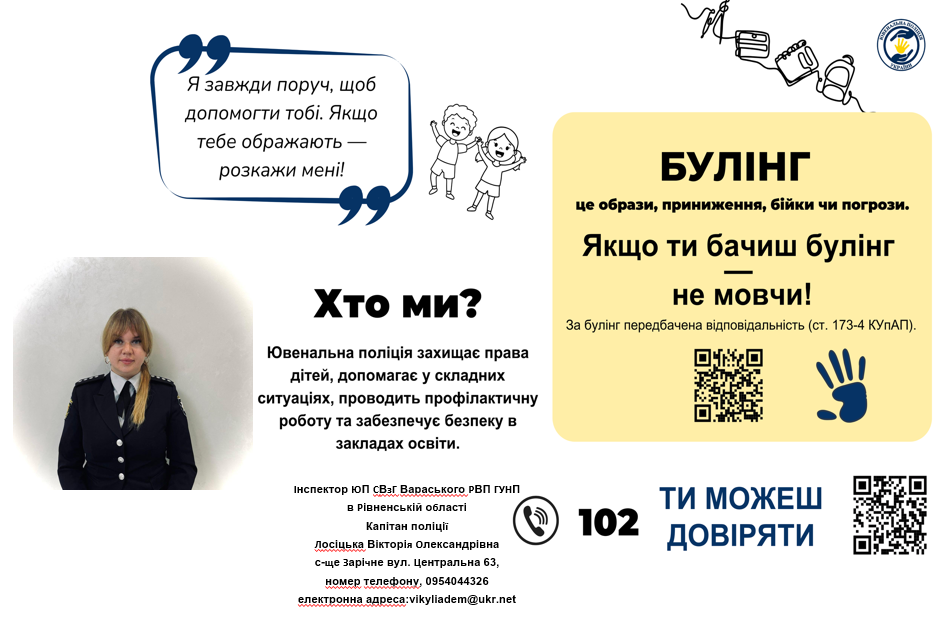 Навчальний заклад обслуговує інспектор ювенальної превенції сектору взаємодії з громадами Вараського РВП ГУНП в Рівненській області капітан поліції Лосіцька Вікторія Олександрівна.